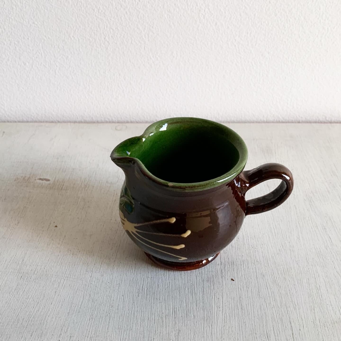 小ぶりな緑のフチの茶色のピッチャー